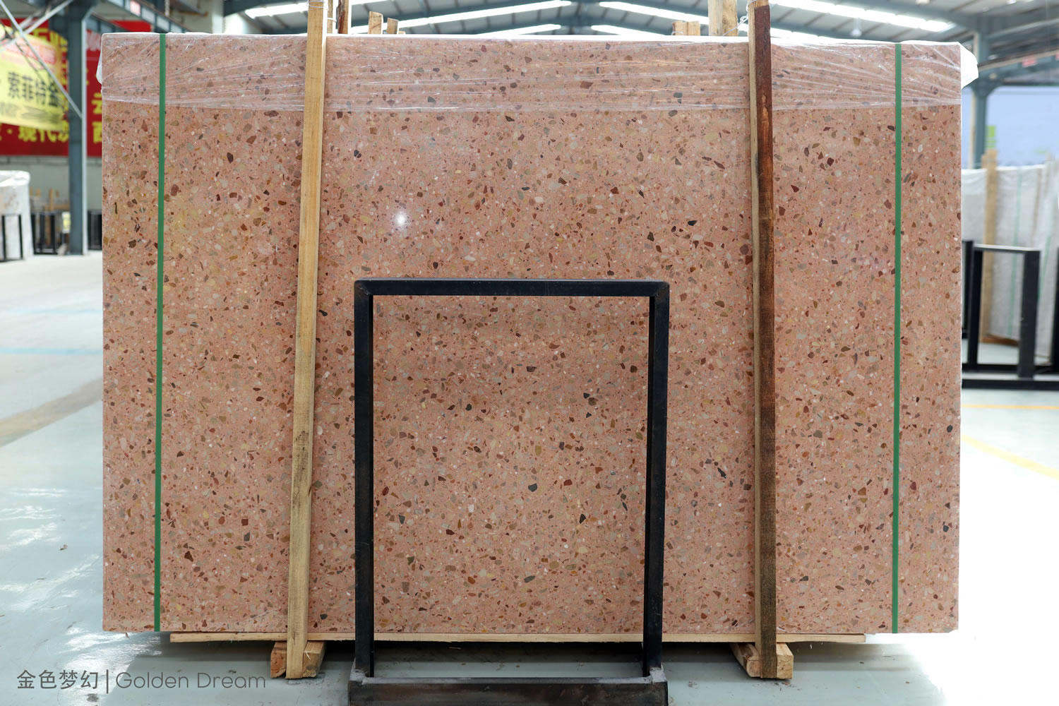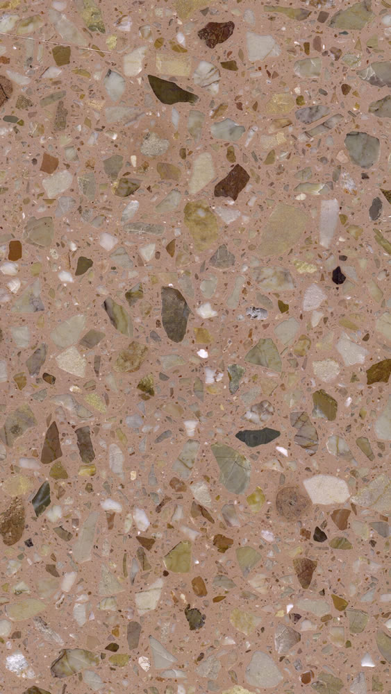 Terrazzo is a composite material, poured in place or precast, which is used for floor and wall treatments. It consists of chips of marble, quartz, granite, glass, or other suitable material, poured with a cementitious binder (for chemical binding), polymeric (for physical binding), or a combination of both. Metal strips often divide sections, or changes in color or material in a pattern. Additional chips may be sprinkled atop the mix before it sets. After it is cured it is ground and polished smooth or otherwise finished to produce a uniformly textured surface. “Terrazzo” is also often used to describe any pattern similar to the original terrazzo floors.